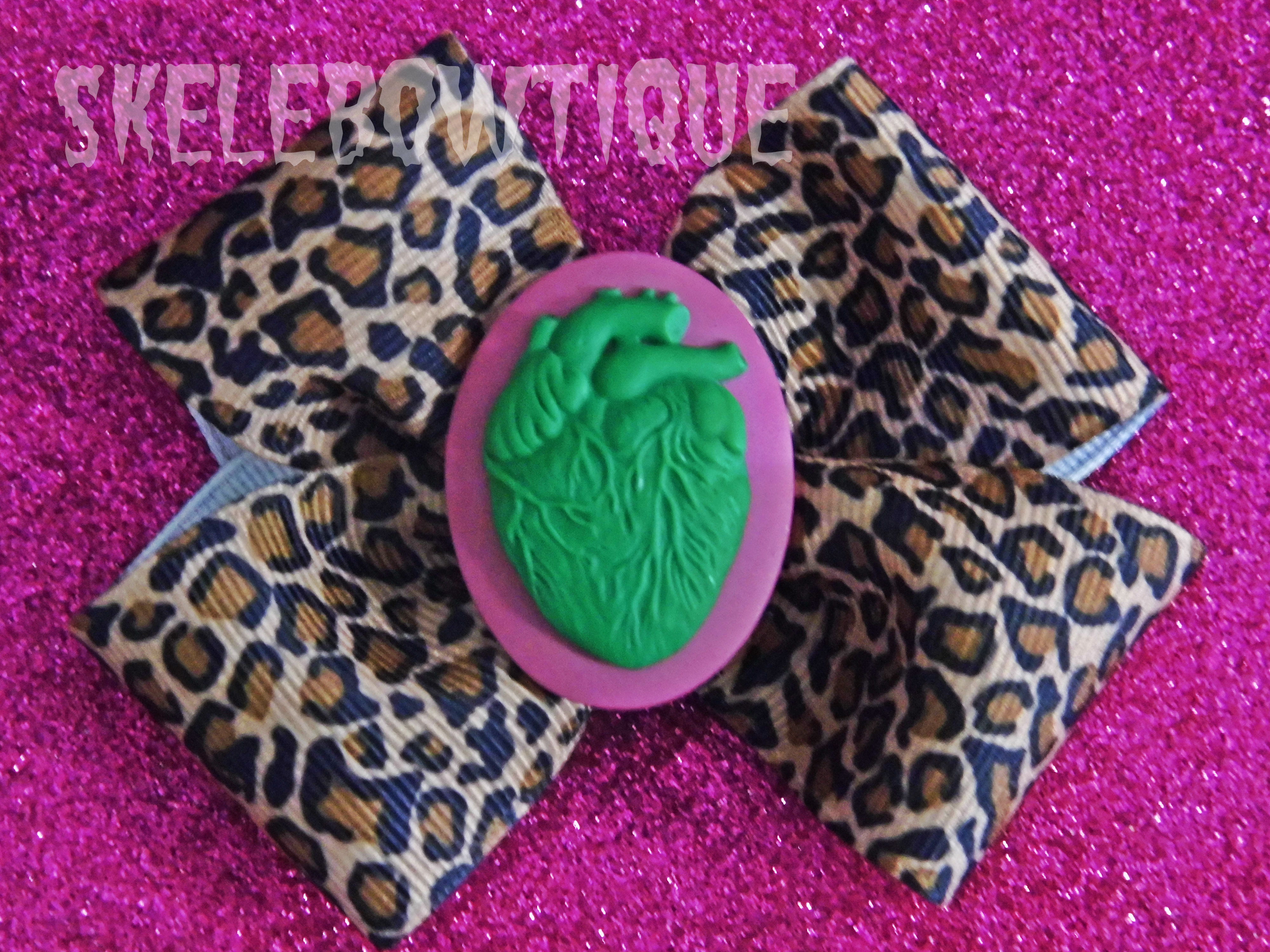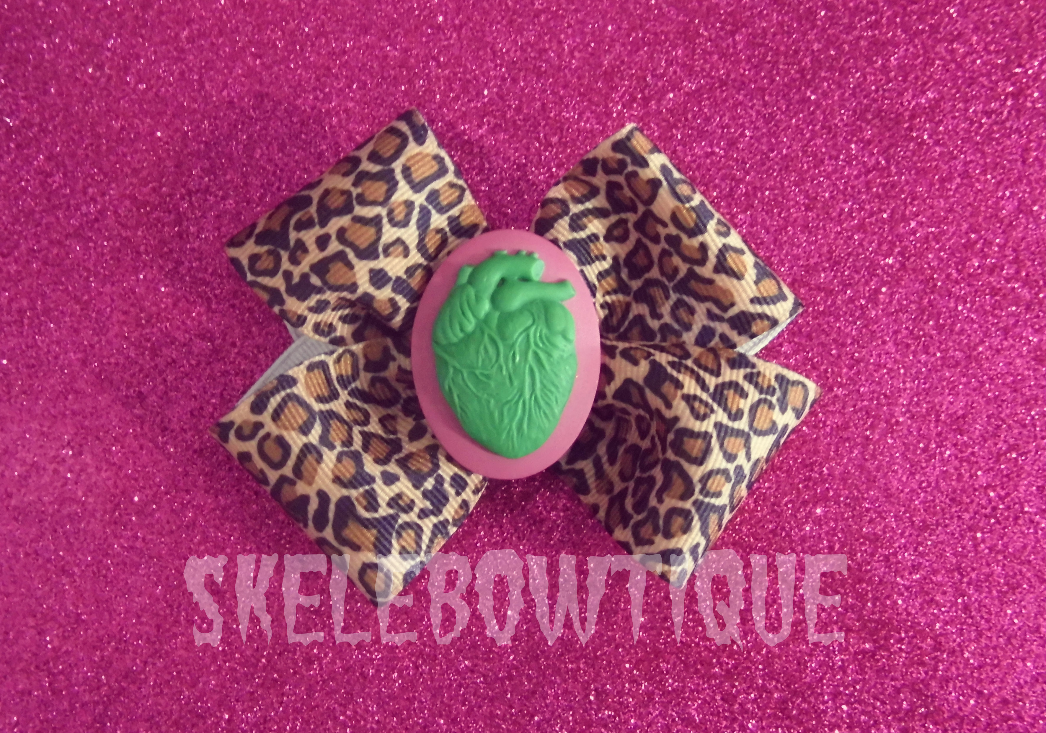 This leopard psychobilly inspired bow comes with a light green and pink anatomically correct heart in the center.