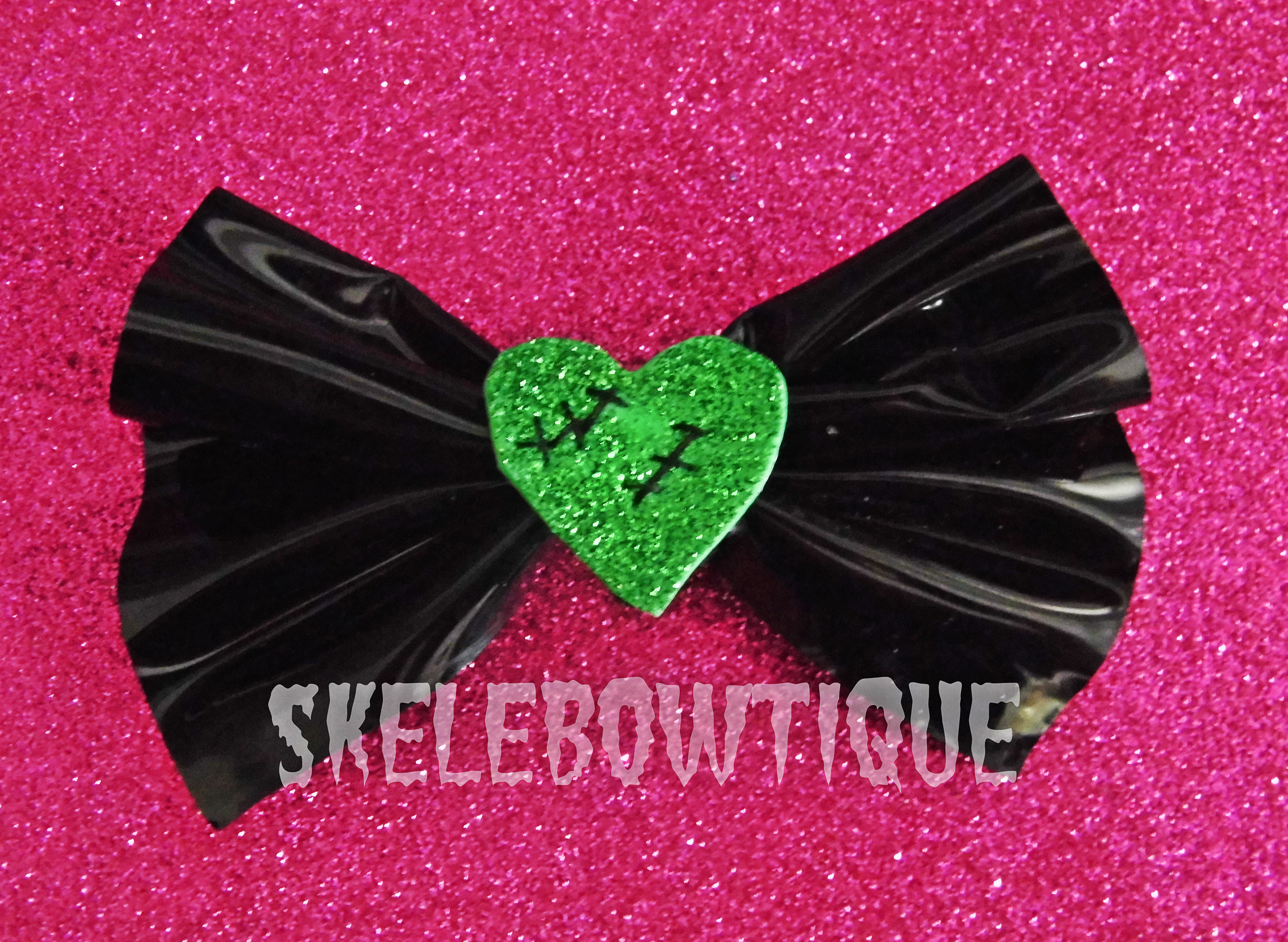 Frankenstein inspired bow. Green glitter heart with black stitches embellish the black latex bow.