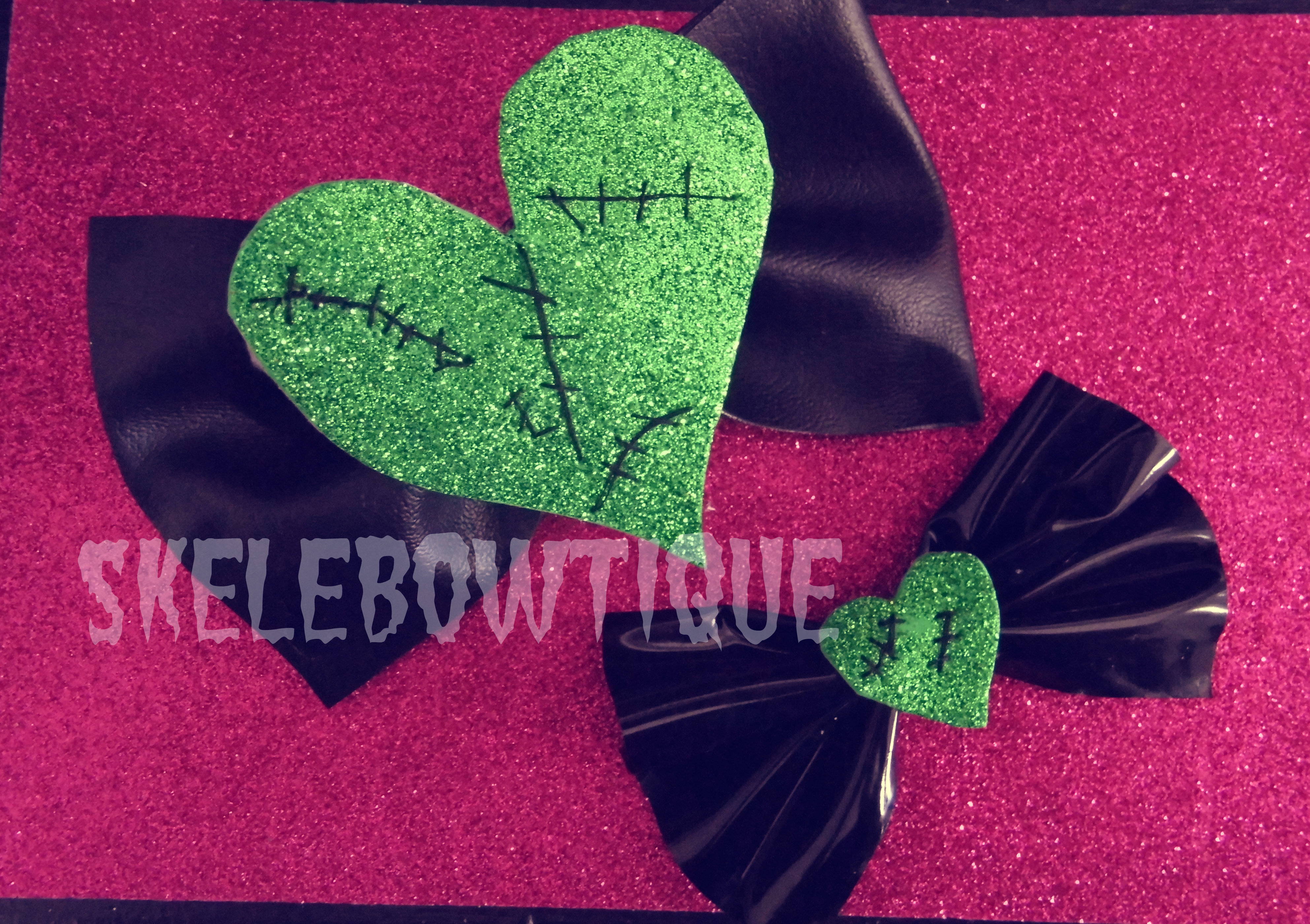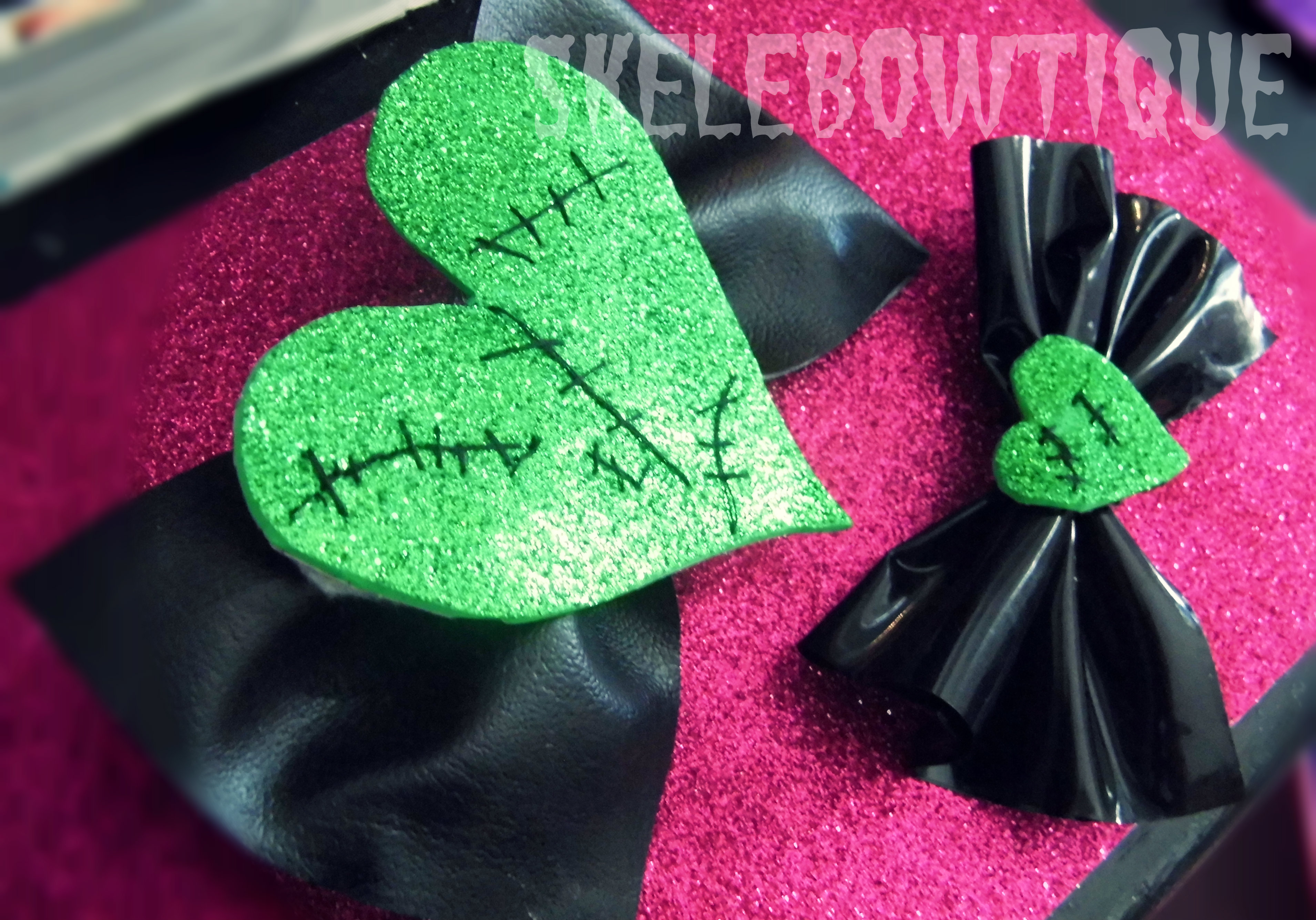 Frankenstein inspired bow. Green glitter heart with black stitches embellish the black vinyl bow.